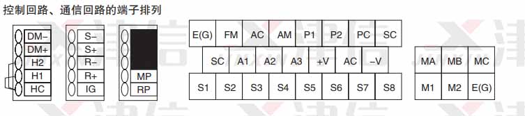 - 控制回路端子+V,-V電壓的輸出電流容量最大為20mA。請(qǐng)勿使控制回路端子+V,-V間短路。否則將會(huì)導(dǎo)致誤動(dòng)作或故障。