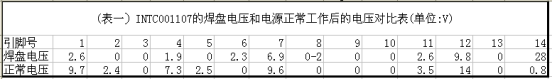 4、檢查電源 IC 的工作情況:裝上 INTC001107,因不知哪個腳為輸出, 且電路板上有膠膜覆蓋,故用指針表直流 10V 檔直接測量電源管 G-E 焊盤電壓, 測量有 3-5V 的波動直流電壓,說明電源 IC 已工作并輸出驅動電壓。