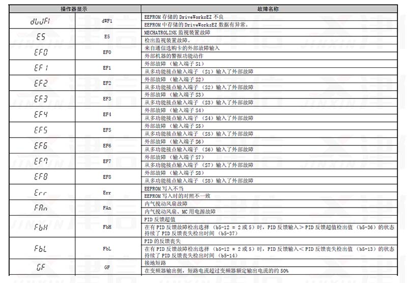 三、dWF1,E5,EF0,EF1,EF2,EF3,EF4,EF5,EF6,EF7,EF8,Err,FAn,FbH,FbL,GF故障代碼