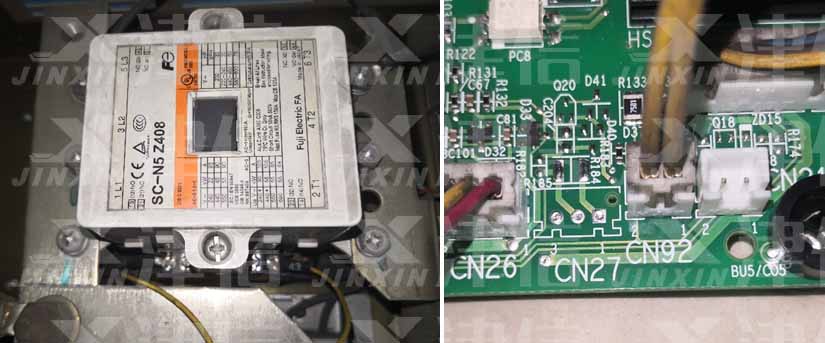 - 發現在報警UV的情況下,變頻器內部主回路接觸器先吸合了后再被斷開。測量主電源以及整流模塊都正常,根據這種現象,初步判斷接觸器以及接觸器相關回路有異常。檢查相關線路,測量接觸器線圈控制電壓正常,測量功率卡上插口CN92信號線未導通,該信號線為接觸器輔助觸點反饋信號。如下圖: