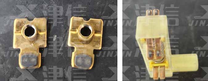 - 斷開主電源,將變頻器內部主回路接觸器拆出,將該接觸器拆卸,發現內部輔助觸頭表面氧化,觸頭接觸不牢靠,導致出現不導通現象。